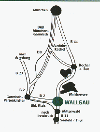 So finden Sie uns: über München die Autobahn Garmisch-Partenkirchen, Ausfahrt Kochel über Kochel am See, Walchensee nach Wallgau/Krün in die Alpenwelt Karwendel Mit der Eisenbahn, stündlich von München - Garmisch-Pa. - Klais |